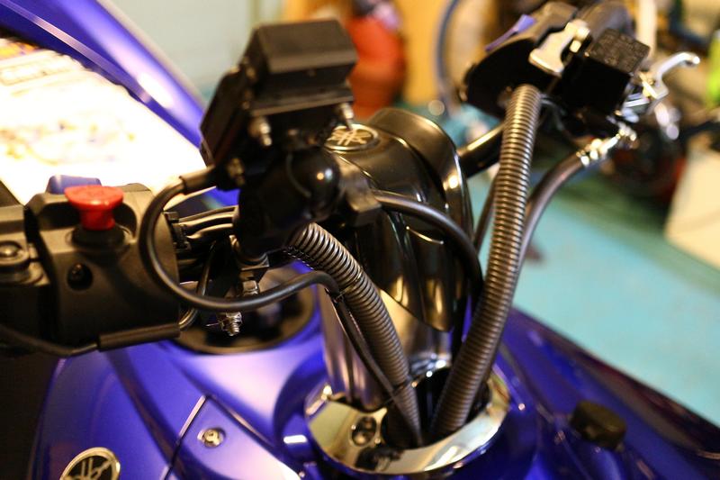 Den skymmer inga instrument heller, men kan sitta oskyddad om jag rullar. Den permanenta elmatningen till Zümons fäste drogs till de framdragna uttagen för laddning. När jag ändå var igång så monterade jag en snabbkoppling till CTEK-laddare där och drog fram den under huven där den är lättåtkomlig.